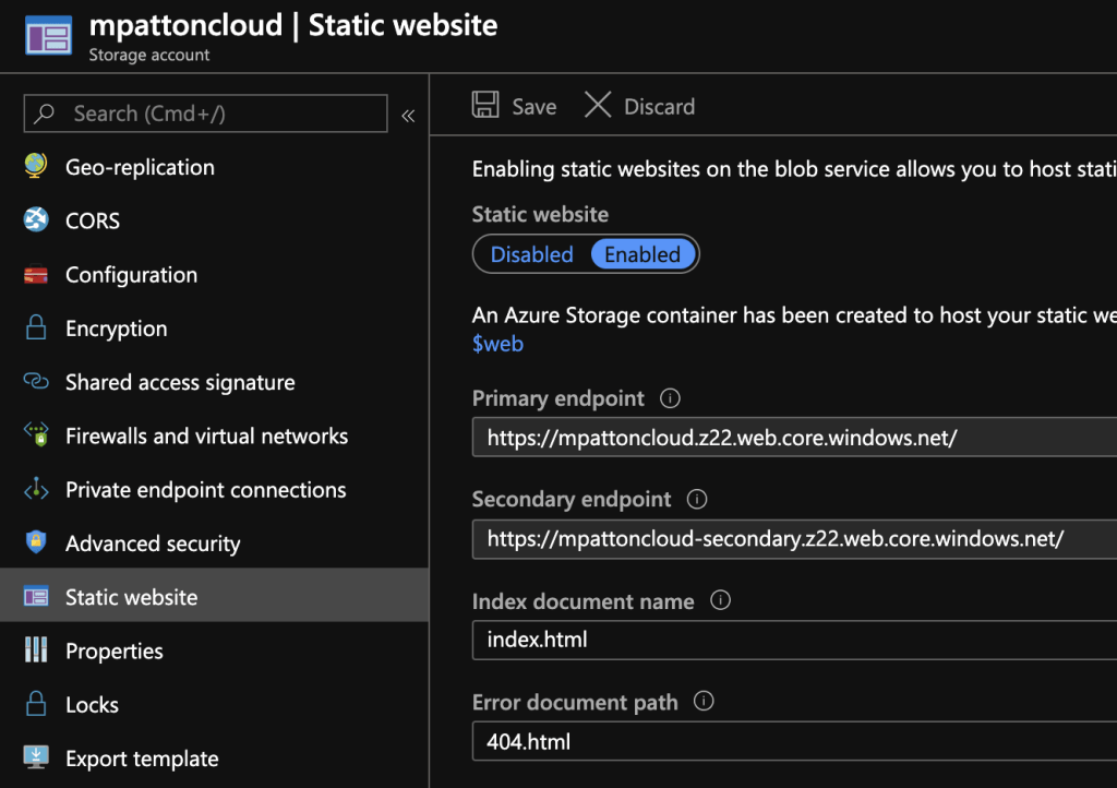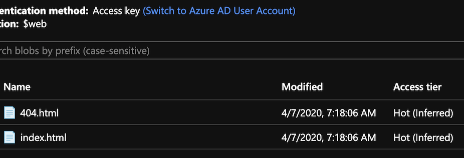 Notice the $web container is automatically referenced in this screen and created in the Storage Account. This is the location where you should upload your static assets with the index and error documents you have already defined: