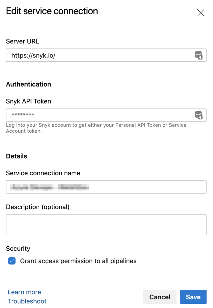 4. Next, create a Service Connection in your Azure DevOps project using the API Key revealed from Snyk.io: