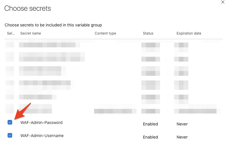 A window will pop-up allowing you to choose which secrets are to be included in the Variable Group: